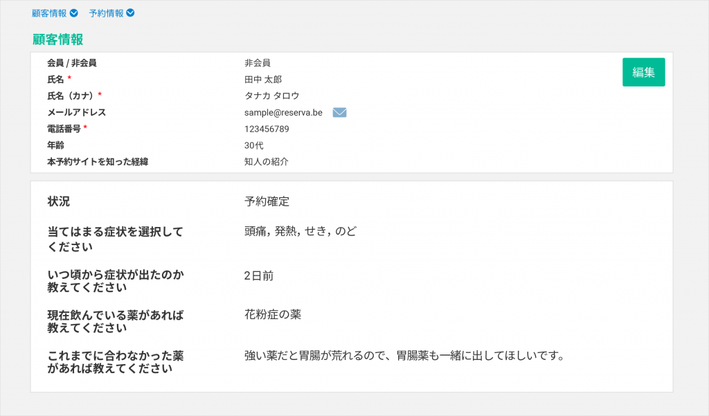 予約時アンケートで収集した回答内容は、管理画面の顧客詳細画面から確認可能です。