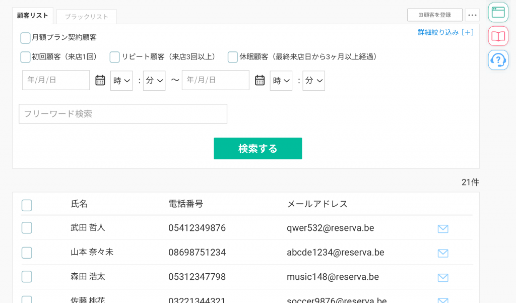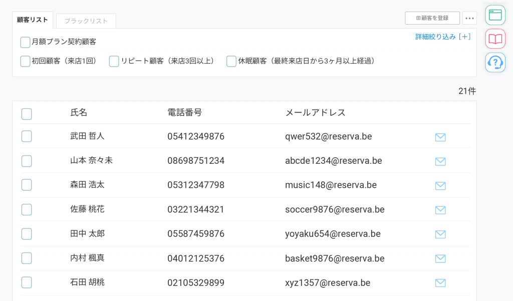 RESERVA予約管理画面の「顧客管理」を選択すると、患者情報が一覧で表示されます。患者に関する情報がまとめられており、ここから患者情報の編集や確認を行います。顧客情報の新規登録や、すでに登録済みの顧客情報を編集できます。