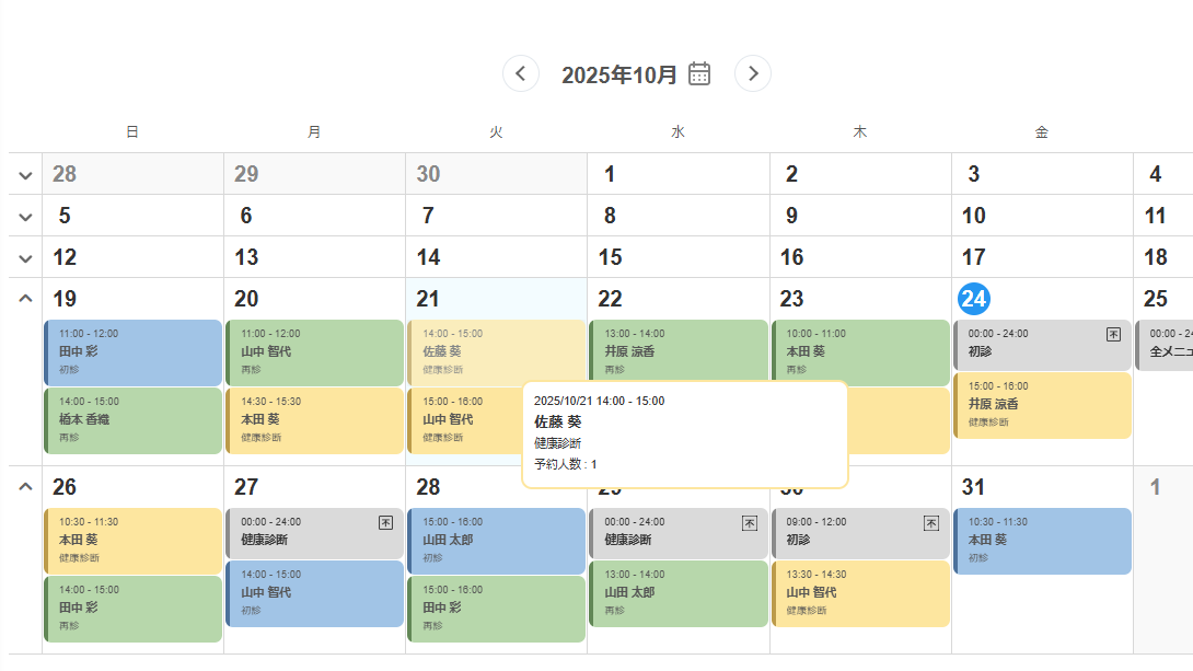 ・予約ブロックをマウスオーバーすると、予約の詳細情報が確認できます。